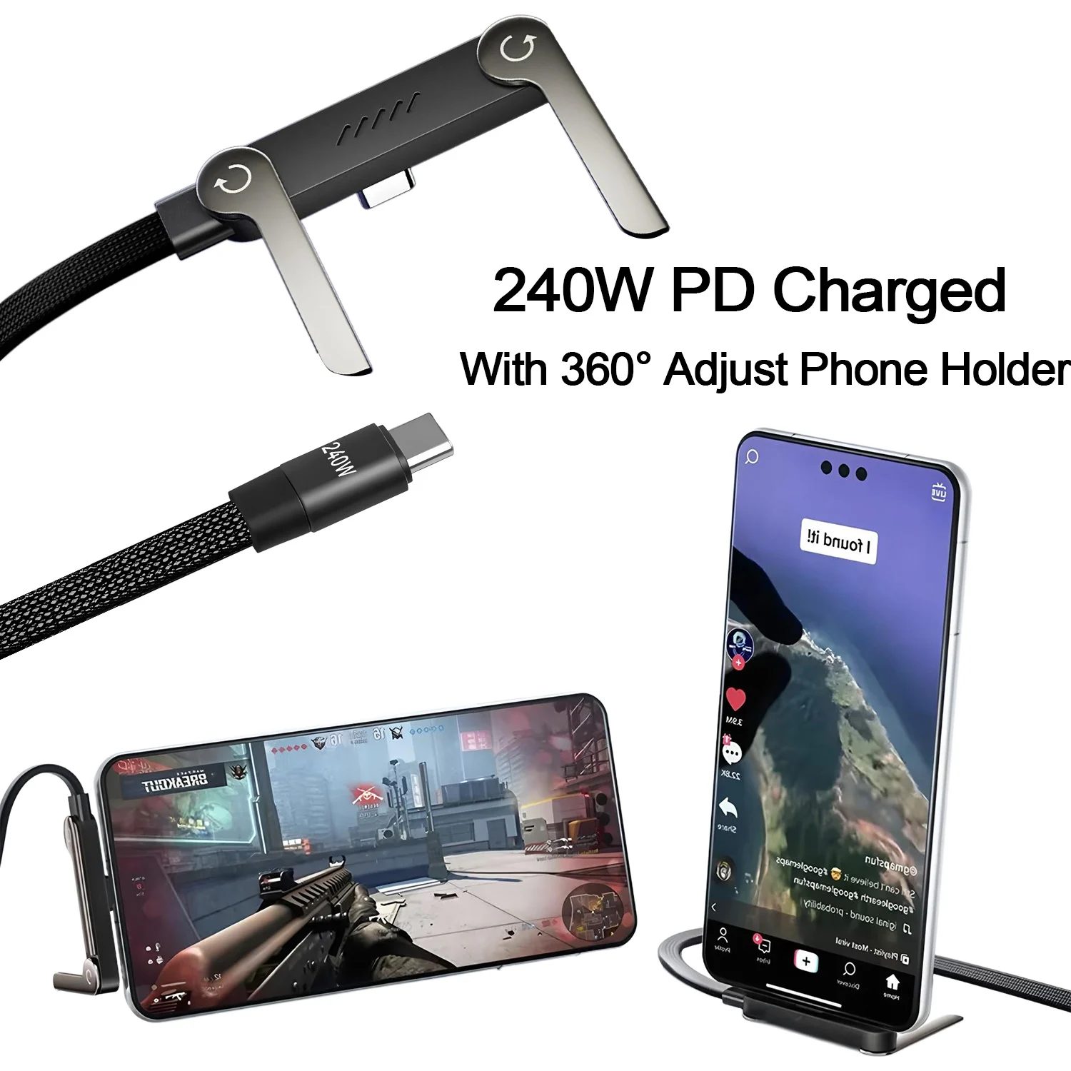240W PD 2-in-1 Fast Charging Cable with Foldable Phone Stand