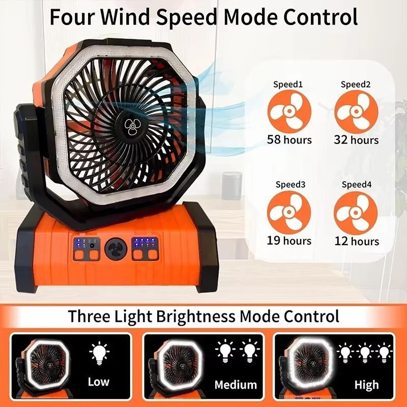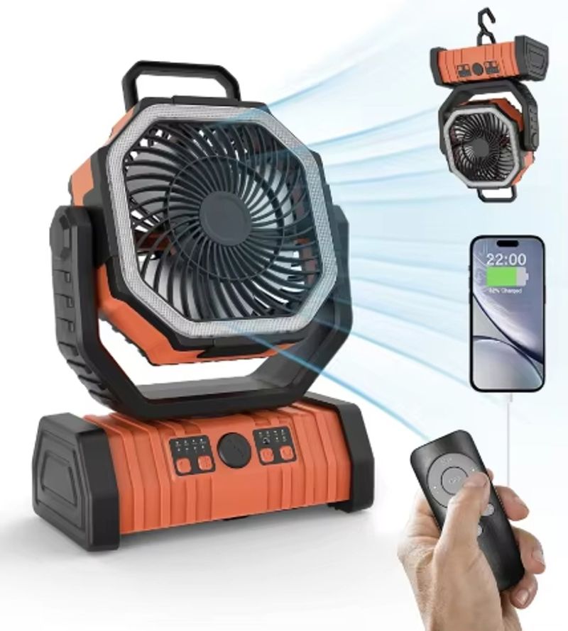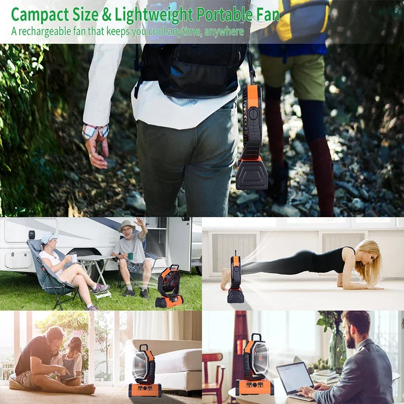 Portable Rotation Outdoor Cooling Fan, Rechargeable Camping Fan with LED Light & Hook
