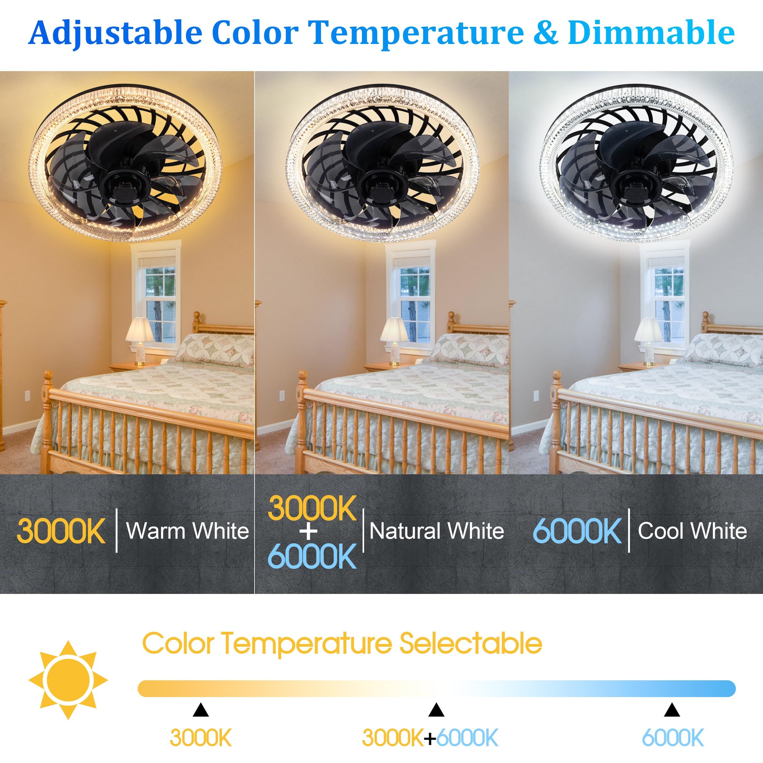 Dimmable Brightness 3000K-6500K, Ceiling Fan for Bedroom, Living Room, Kitchen
